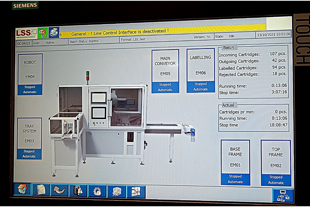 After labelling, the cartridges are transferred onto the LSS in-line outfeed, where the cartridges are aligned with the bypass facing up for further handling in a pen assembly station.
